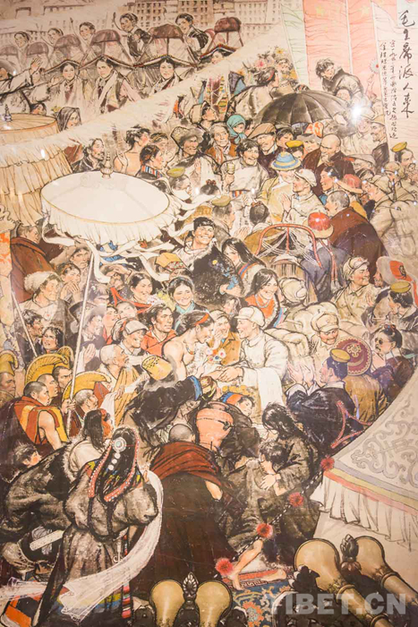 鑒賞展現(xiàn)場,不少前來參觀的畫家都是韓書力的學(xué)生或在一定時期曾受其教導(dǎo)?!?973年,我在西藏自治區(qū)展覽館見到了韓書力老師,第一次見面我就拜了師。我們一起下鄉(xiāng),我就給他當導(dǎo)游和翻譯。30幾年來,我一直在學(xué)習(xí)韓老師的繪畫技法,到現(xiàn)在還是他的學(xué)生。韓老師創(chuàng)作《毛主席派人來》時,我就跟在旁邊學(xué)習(xí)。學(xué)到了一些創(chuàng)作獨幅作品的技巧和手法,讓我受用至今?!蔽鞑厍嗄戤嫾矣嬅莱嗔姓f。