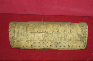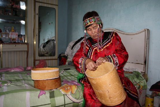 鄂倫春族素有“白樺民族”之稱,白樺樹皮制品種類非常多,大到可以乘人載物的樺皮船、圍蓋“仙人柱”的“鐵克沙”,小到可以裝在衣兜里的煙盒和含在口中的狍哨,提水用的桶、采集用的簍、裝物用的箱、盛飯用的盆、吃飯用的碗、喝酒用的蠱等等。樺樹皮制品的裝飾圖案可以通過壓劃、壓?。c刺)、剔刻、烙燙、補花、繪畫等多種方法形成。壓印點刺是最常用的裝飾手段,工具是用獸骨制成的,分單齒、雙齒、多齒和簡單幾何形幾種。先在剪裁好的器物材料上,用壓、打等方法點刺出裝飾紋樣,再縫合成器物成品。這種裝飾多為素面凹形花紋,顯得樸實單純,而且器物越陳舊樺皮顏色越深,越有光澤,圖紋越清晰。也有人在壓打線上著色,這便形成了另一種風(fēng)格,美觀艷麗而且突出了物象特征。