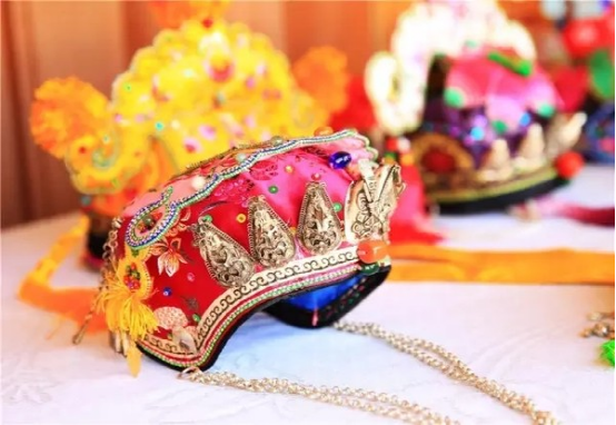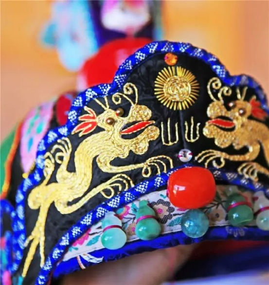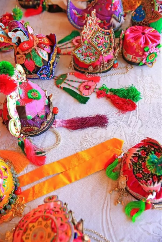 走進(jìn)楊文煥的工作室,猶如進(jìn)入一個明媚鮮艷的夢境。首先映入眼簾的,便是那一頂頂色彩鮮艷、繡工精致的童帽:造型大方、線條流暢的獅子帽;色彩明艷、虎虎生威的老虎帽;精巧別致、活潑可愛的翹尾帽;高雅富麗、古韻悠長的公子帽;別具一格、特色鮮明的牌坊帽。