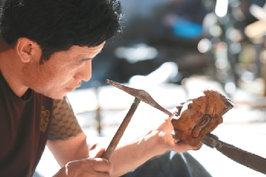20歲前的次嘎已可以承接一些佛像的鍛敲任務(wù),掌握的技術(shù)遠遠超出一起學(xué)習(xí)的其他學(xué)徒們。從鍛敲佛像的蓮花底座、焊接,再到鍛敲銅佛造像上半身、下半身,再到慢慢地開始做些佛像飾物。偶爾,次嘎也能涉獵造像的臉部。這是一個造像師手藝達到最好時才可以觸及的部位?!懊娌拷Y(jié)構(gòu)復(fù)雜又微妙,面部表情的刻畫更是難上加難。作為一個造像師,這是最考驗功力的地方,每一次敲打都在決定作品的成敗。”次嘎說道。