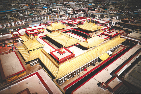 2011年,我區(qū)全面啟動大昭寺金頂維修工程,朵普·次嘎積極參與到大昭寺金頂修繕保護工程當(dāng)中。 圖為大昭寺金碧輝煌的金頂。