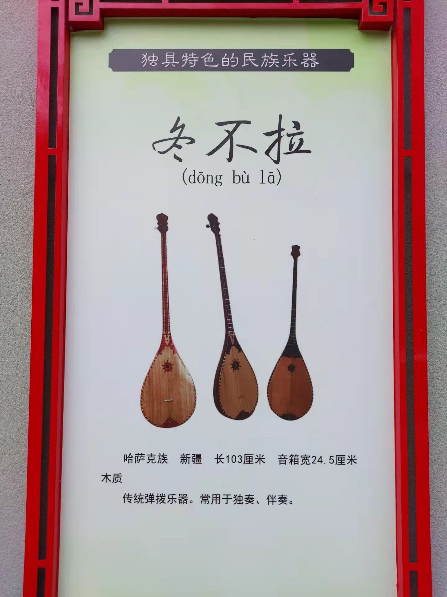哈薩克族,新疆,長(zhǎng)103厘米,音箱寬24.5厘米,木質(zhì)。