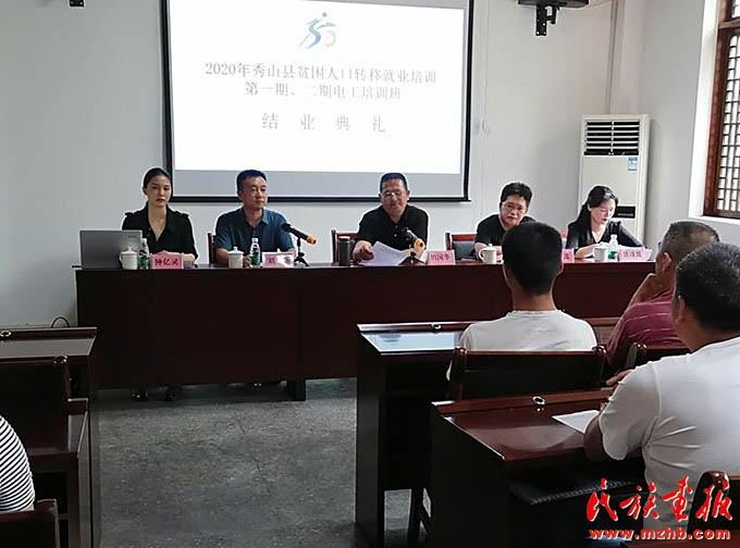 2020年6月29日,鐘億靈(左一)出席在清溪場鎮(zhèn)武陵山致富帶頭人實訓基地舉行的秀山縣2020年貧困人口轉(zhuǎn)移就業(yè)培訓第一、二期電工培訓班結業(yè)典禮。(秀山縣人民政府網(wǎng))
