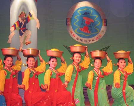 頂水舞因舞者頭頂水罐起舞而得名,是朝鮮族女性表演的傳統(tǒng)舞蹈。朝鮮族婦女習(xí)慣用頭部頂著器物行走,在插秧、鋤草季節(jié),婦女們常頭頂水罐將飲水或米酒等送至田間地頭。頂水舞即在這種生活習(xí)俗基礎(chǔ)上形成,而且一經(jīng)形成,便在群眾中間廣泛流傳。上世紀50年代初期,頂水舞在延邊各地隨處可見,成為當?shù)厝罕娮顝V泛的民間舞蹈之一。舞者頂?shù)乃?,原是生活中的實物,后來為了便于起舞,多用紙糊的罐型道具,在表層上繪以漂亮的花紋,輕巧別致。隨著道具變化,舞蹈動作也相應(yīng)發(fā)展。頂水舞以“挫墊步”“踏波步”“碎步”為基本步伐,主要動作有“甜泉舀水”“玉指彈珠”等。舞蹈通過模擬頂罐行進中的各種動作,抒發(fā)歡樂喜悅的內(nèi)心感情,舞姿輕松優(yōu)美。