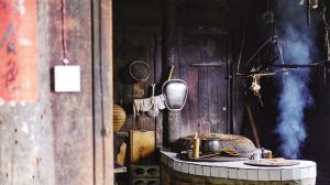 鏡頭的取景框內,青菜在“古井”潺潺流水中淌去泥沙,沿著苔蘚步道,裝在背簍里被送入小院;陽光透過窗欞灑下,熏黑的灶臺,柴火劈啪作響,趁著火候,幾下翻炒,白霧便混合著農家飯香騰騰升起。