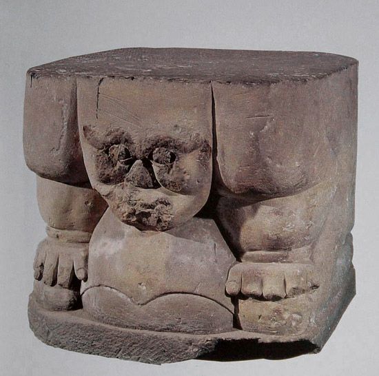 圓雕,白砂石質(zhì),近似正方體。圓雕男性人像,面部渾圓,顴骨高突,粗眉上翹,雙目圓睜且外突,鼻梁短粗,獠牙外露,下頜置于胸前,裸體,腹有肚兜,肩于頭齊,肘部后屈,雙手扶膝,下肢屈跪,背部平直。座頂左上角陰刻西夏文三行,計(jì)15個(gè)字。第一行4字漢譯為“小蟲曠負(fù)”;第二行4字漢譯為“志文支座”;第三行7字漢譯為“瞻行通雕寫流行”。背部陰刻漢文一行6字“砌壘匠高世昌”,為西夏石雕工匠的姓名,彌足珍貴。雕像以夸張的手法表現(xiàn)了負(fù)重者的神態(tài),反映出西夏時(shí)期石雕藝術(shù)的獨(dú)特風(fēng)格。迄今在西夏陵區(qū)多座帝陵的碑亭遺址中,已出土這類支座14件,但刻有西夏文字的僅此一件。