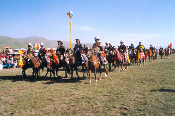 賽馬時藏區(qū)最普及的運動,各地都有賽馬會,一般在牛羊肥壯的七八月份舉行。賽馬有多種,有跑馬、走馬、馬上射擊、馬上拾哈達等。跑馬是比賽速度的,賽程有兩三公里的,也有十公里左右的。騎手大多是年輕人和十幾歲的少年,牧區(qū)賽馬多無馬鞍。比賽時,馬鬃馬尾挽上五色彩綢。跑馬比賽參加的馬匹多,競爭很激烈,以先到終點者為勝。賽走馬不但看速度,還要看馬的步伐和走勢,好的走馬不但速度快,步伐也非常平穩(wěn)。走馬的騎手多是善于策馬、精于騎術(shù)的成年人。走馬比賽在甘青藏區(qū)比較流行。