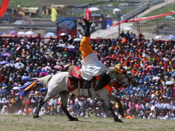馬上運動驚險刺激,是藏族人民非常喜歡的運動,每當(dāng)舉行賽馬活動,親朋好友都要前去助陣,得勝者都有獎勵,親戚朋友還要為得勝的主人和馬披紅掛彩。