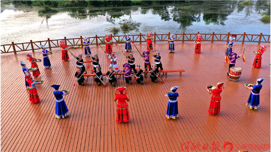 都安各族群眾在澄江國家濕地公園表演打扁擔。