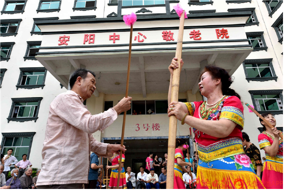 河池文藝志愿者在與老人一起“打扁擔”。