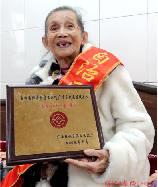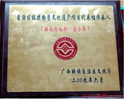 今年已經(jīng)88歲高齡的“壯族打扁擔”技藝傳承人唐小琴,她從小即耳濡目染,跟村里老人、長者學習打扁擔,后因打扁擔需要指揮,又學習皮鼓打法。1961年4月,唐小琴從學校調入縣文化館任文化藝術輔導員,挖掘整理了《壯族打扁擔》《板凳舞》《斑鳩舞》等一大批傳統(tǒng)舞蹈,并多次在自治區(qū)、河池地區(qū)的比賽、調演上獲獎。1986年退休后,仍然致力于《壯族打扁擔》的傳承工作,2004年,組建都安縣老干康樂藝術團,帶動安陽鎮(zhèn)退休老人學習打扁擔技藝。2009年,她被確認為自治區(qū)非物質文物遺產(chǎn)項目“壯族打扁擔”代表性傳承人。