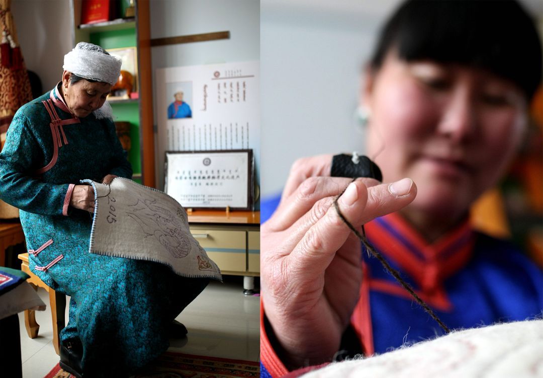 蒙古包穹頂?shù)絻?nèi)壁,從門簾到地上鋪的毛氈,從日常家居的蓋布到商旅使用的茶鹽袋,蒙古族人將細膩的各式花樣運用在食衣住行的各個方面。而這些精美絕倫的裝飾都有一個共同的名字,那就是蒙古族氈繡技藝。