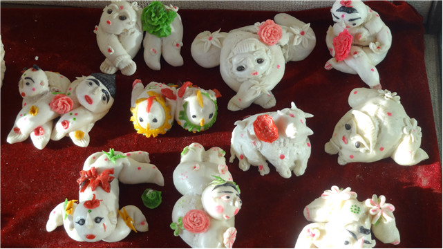 1、春節(jié)(過大年)來臨前,家庭婦女用白面捏制小狗、小貓、玉兔、魚娃娃、蓮花的面塑制品,上面點綴紅棗、花生等。以象征萬事如意,多福多壽、家庭和睦。