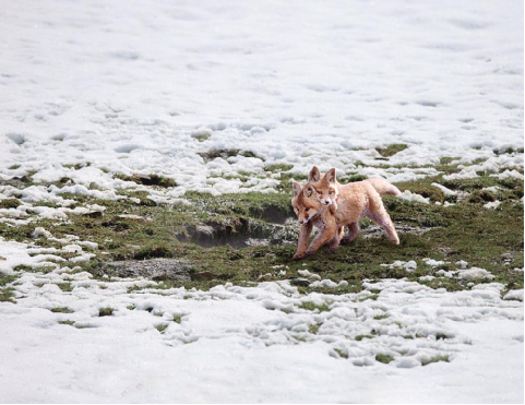 整整一天,沒見到赤狐爸爸媽媽捕食回來,三只小家伙變得急不可耐,小心翼翼地向著爸爸媽媽出去的方向跑,沖出10米開外,又無奈地轉身跑回,蹲在洞口,顯得失望又焦慮。
