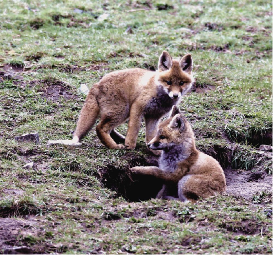 藍天白云,微風輕漾;草地碧綠,鳥語花香。大自然的美景圖正在小赤狐的家園四周徐徐展開。在膽大的小赤狐的叫喚聲里,躲在洞內的另外兩只小赤狐也壯著膽子探出頭來。不一會兒,它們習慣了周圍的環(huán)境,三只小赤狐在離洞口5米遠的范圍內嬉戲玩耍著。它們時而跳躍,時而奔跑,展現(xiàn)出本能的捕獵動作。稍大一點的小赤狐騎在小一點赤狐的背上嬉戲玩耍,小赤狐也不示弱,奮力反擊,猶如兒童打鬧,其樂無窮。那烏黑溜圓的眼睛彎了又彎,毛茸茸的尾巴高高地翹起,身體嬌小,惹人喜愛,讓人看了會產生想上去抱一抱、摸一摸小赤狐身軀的念頭。