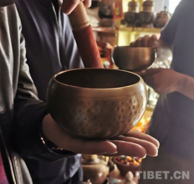 有兩位商人告訴我,所謂的sing bowl是一種“神秘”的銅制品。當(dāng)最初看到這種“神秘”的東西時,我有些懷疑他們所謂的“神秘”性。因為從外觀上看,sing bowl就是一種大些的銅碗。但是,當(dāng)商家自信地演示,我見證了所謂的“神秘”。總結(jié)起來,主要有三個方面:第一,這種銅碗確實會“唱歌”,只需用一個小小的木棒沿著碗的邊緣旋轉(zhuǎn),“歌聲”就會由小到大。但其中有兩個要點,一是要緩緩地旋轉(zhuǎn),不可以太快;二是要順時針旋轉(zhuǎn)。第二,發(fā)出“嗡嗡”的“歌聲”的同時,從托著碗的手掌處會產(chǎn)生一種震動,商家說,在尼泊爾和印度,這種震動被認(rèn)為對內(nèi)臟的健康極有好處,所以有治療五臟六腑病患的功效。第三,一般以左手托碗,右手持木棒沿碗的邊緣旋轉(zhuǎn)。