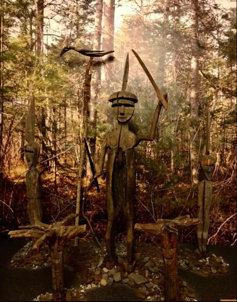 展區(qū)內還放置著一組木質神偶,這些神偶來自赫哲族部落。佇立在最中間的神偶起著山神的作用,面目清晰與人等高,手中舉著木劍,挖空的腹部能吞掉妖魔鬼怪,一顆碩大的心臟代表強悍的法力,靠墻斜放著一根高高的木桿,頂端棲息著一只鳥(喬卡鳥)。