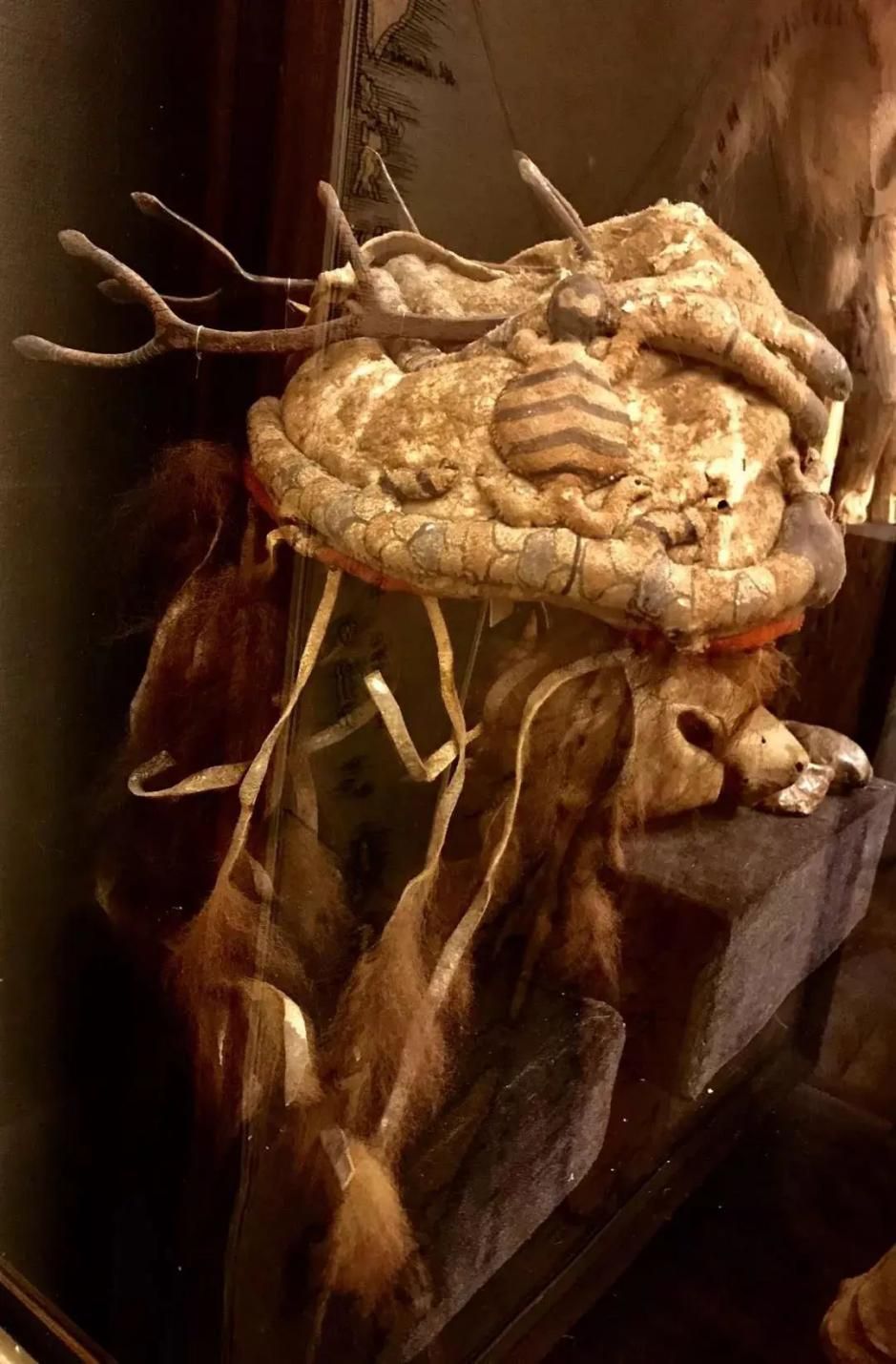 展區(qū)內還陳列著幾套保存完整的薩滿服飾,有鹿皮、獸皮、魚皮和纖維等多種材料。與國內留存的薩滿服飾不同的是其鹿角帽的制作,鹿角帽上裝飾著龜、蛇和神偶形象,頂端八岔鹿角的材料是金屬。