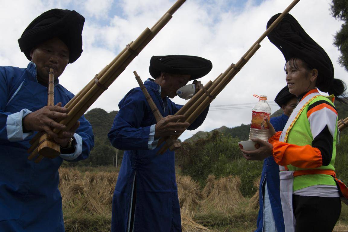 就這樣年復(fù)一年的干活,后來因?yàn)榇蠹夷挲g大了,干活賣力糧食也豐收了。大哥就想,現(xiàn)在能吃飽了,要讓大家有個(gè)玩的地方和玩的工具。想去想來,他用家里面的葫蘆,把笙管插進(jìn)去,一吹又是有一種味道。所以大哥就把竹管插進(jìn)葫蘆里面,把聲音通過仔細(xì)調(diào)音制出了蘆笙,六個(gè)聲音當(dāng)時(shí)叫做六笙,后來才叫做蘆笙。