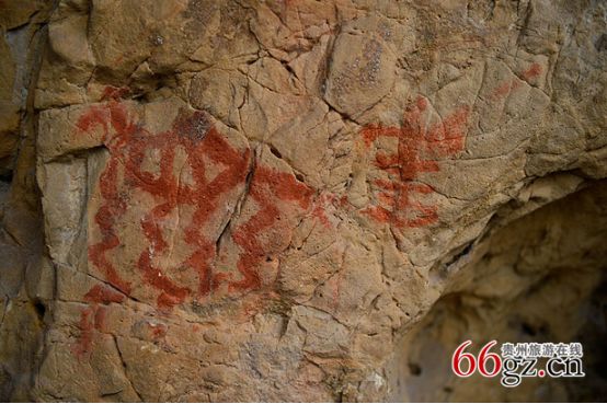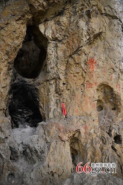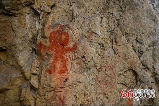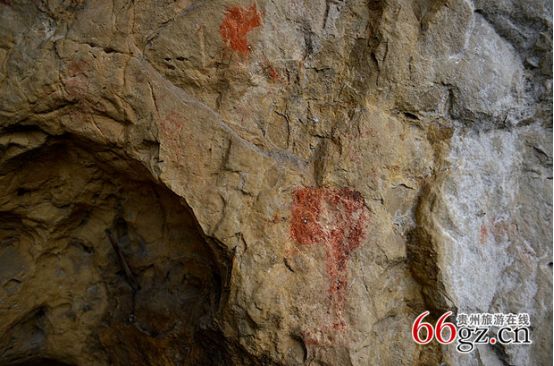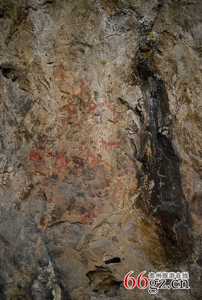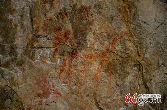 據(jù)資料載,金山洞古代崖畫以赭色涂繪人、馬、狗等等,隱約可見形態(tài)各異的大小圖像二三十個。人物多作行走狀,亦有雙手高舉者,似乎在祈禱。從其畫風觀察,與相距不遠的省級文物保護單位--長順龍家院崖畫十分相似。