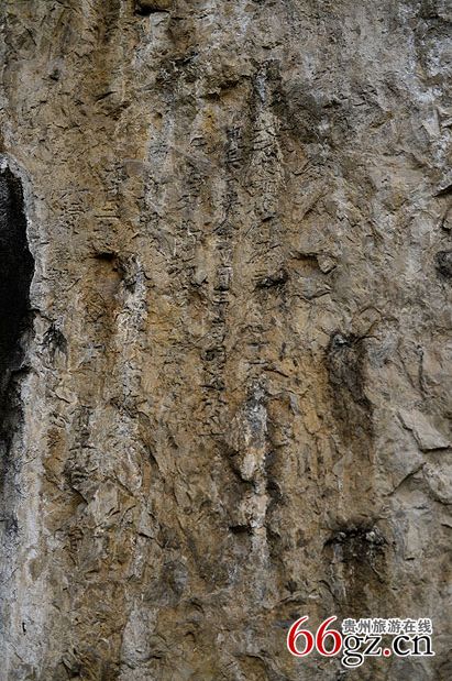 金山洞摩崖是貴陽市花溪區(qū)最早的摩崖石刻,也是貴州最早的摩崖石刻之一。該摩崖石刻位于燕樓鄉(xiāng)東北三里的金山洞巖壁上。其山上豐下儉,古人利用自然山形,在可避風雨的洞壁上摩巖、題刻賦詩作畫。整個摩崖面積通高140厘米,寬74厘米;自右至左豎行排列,共6行82字。據(jù)系楷書陰刻,書法古樸流暢,具有較高的歷史價值。