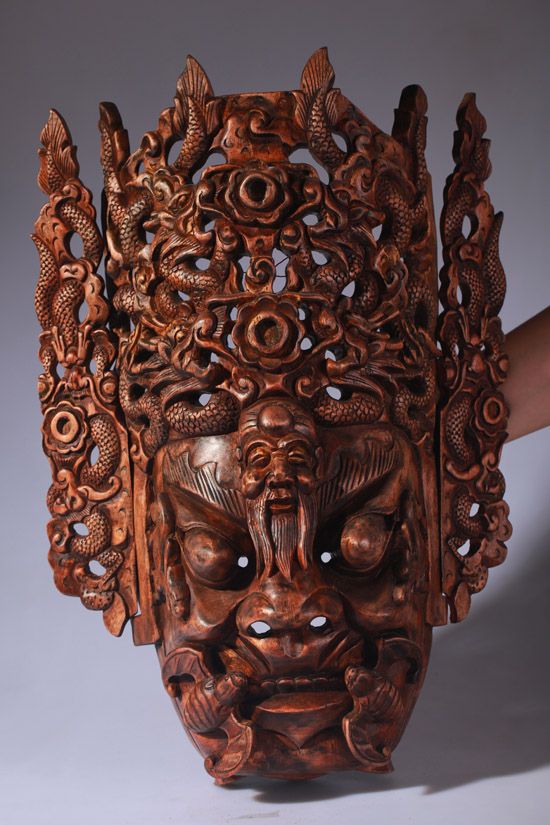 描述:程咬金,字義貞,原名咬金,后更名知節(jié)。驍勇善戰(zhàn),歷史上是唐朝開(kāi)國(guó)名將,以“三板斧”的形象在民間廣為流傳。在地戲唱本《薛仁貴征東》和《薛丁山征西》中,均有程咬金的出場(chǎng)。根據(jù)《隋唐演義》的內(nèi)容,程咬金雖然頭腦簡(jiǎn)單,卻是個(gè)有福之人,被認(rèn)為是福將,所以在地戲面具的刻畫(huà)上,在嘴角兩側(cè)雕刻上一堆蝙蝠,以取“?!钡闹C音。又因?yàn)槌桃Ы鹪谔拼闶情L(zhǎng)壽之人,故爾額頭上刻一壽星,帶給人福壽雙全的吉祥含義。