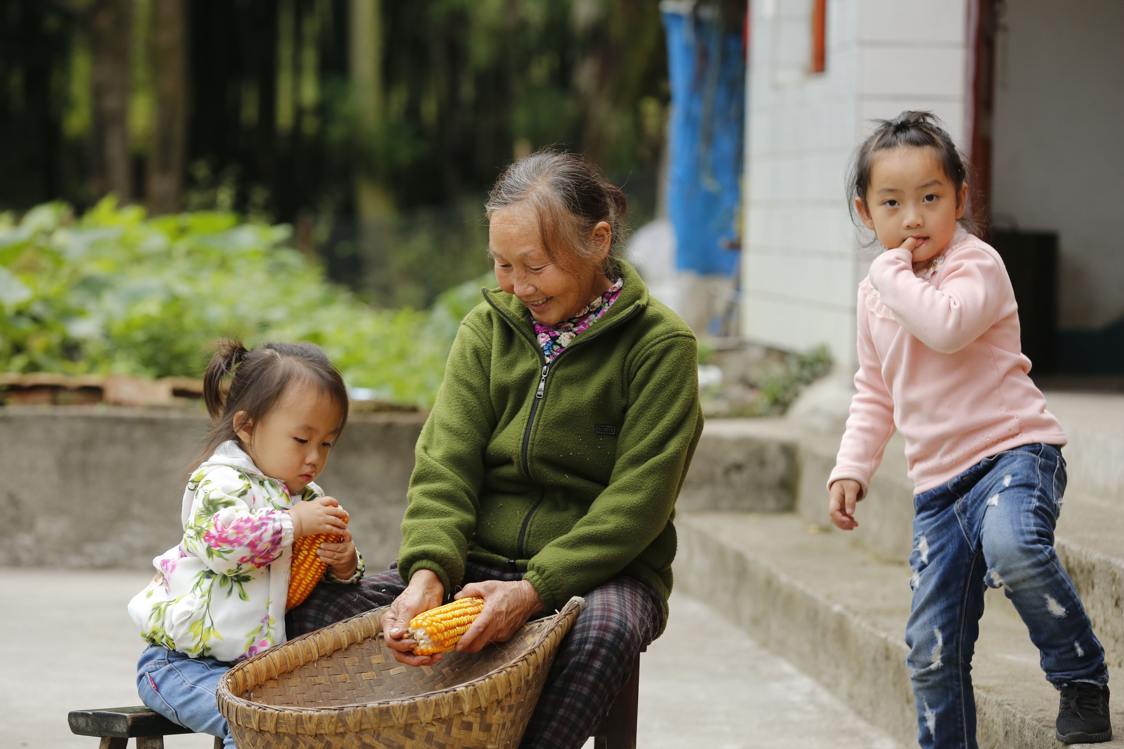貴州貴陽苗族日常生活-老年人與兒童剝玉米